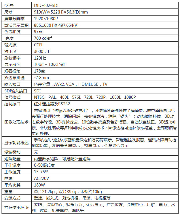1. 產品采用三星DID液晶拼接屏,雙邊拼縫18mm,采用高分辨率(1920×1080)、高亮度(700cd/m2)、高對比度(3000:1)、寬視角(178度)的高清LCD顯示面板,支持1080P全高清數字視頻顯示。